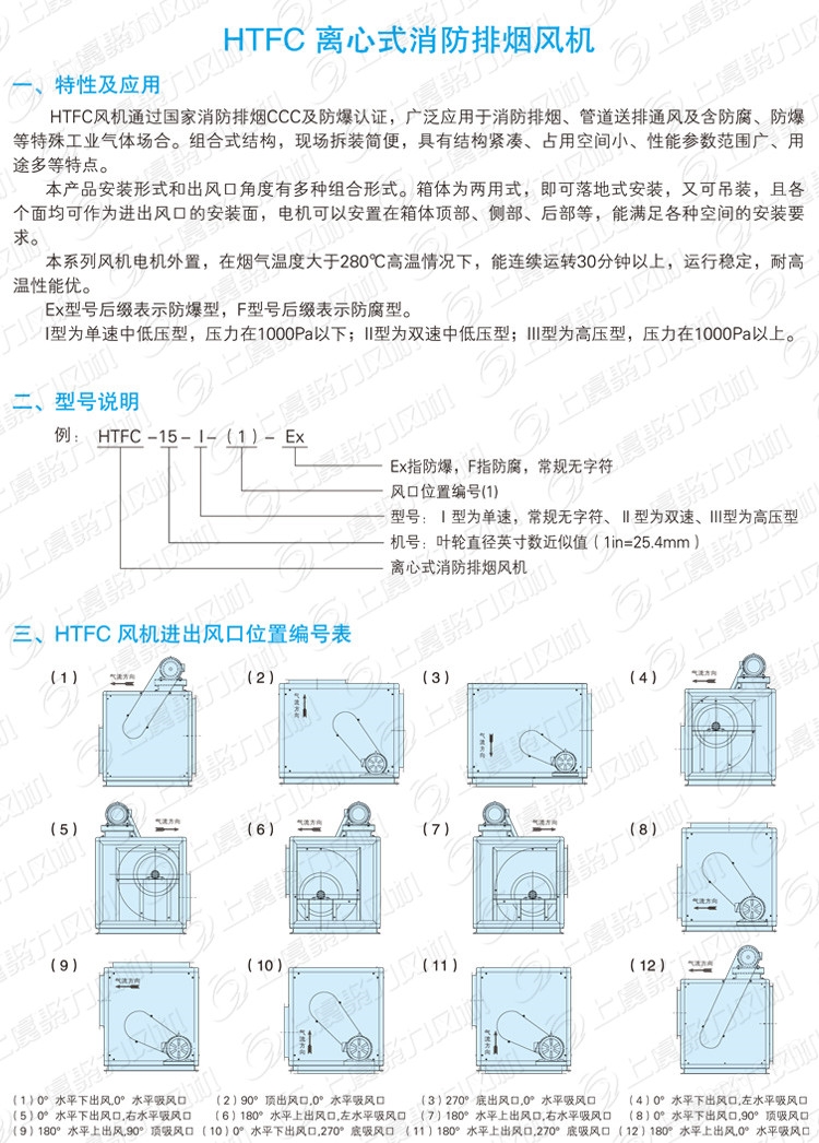 1.1.HTFC型柜式離心風(fēng)機是一種高效率、低噪聲箱式離心風(fēng)機。產(chǎn)品由低噪聲前傾多翼離心風(fēng)機、電機、軸承、傳動件、消聲型箱體等組成。根據(jù)安裝位置的不同,提供12種不同的角度的進出風(fēng)口位置,以滿足用戶不同的安裝需要。根據(jù)消防與通風(fēng)的不同要求分A式和B式兩種類型,A式電機裝在箱體外,用于消防排煙,并經(jīng)國家消防裝備監(jiān)督質(zhì)量檢驗中心按GA211-2009《消防排煙風(fēng)機耐高溫試驗方法》進行耐高溫試驗,能在280℃高溫條件下連續(xù)運行30分鐘以上;B式電機裝在箱體內(nèi),用于通風(fēng)換氣。